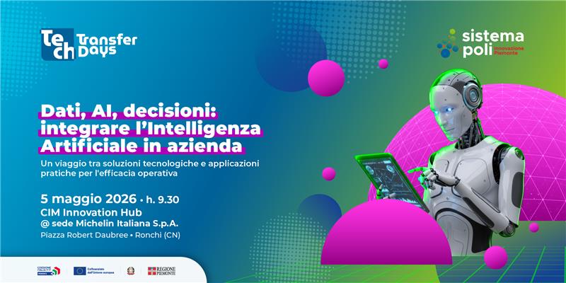 Dopo il successo del primo evento dedicato alla simbiosi industriale proseguono i Tech Transfer Days organizzati dal Sistema Poli d'Innovazione della Regione Piemonte. Al centro del secondo appuntamento, uno dei temi più strategici per la competitività delle imprese “Dati, AI, decisioni: integrare l’Intelligenza Artificiale in azienda”. Un viaggio tra soluzioni pratiche con un obiettivo chiaro: mostrare come l’Intelligenza Artificiale possa supportare concretamente le imprese – in particolare le PMI – nei processi decisionali, a partire dall’utilizzo strategico dei dati aziendali.